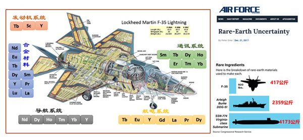 稀土具有極高的經(jīng)濟價(jià)值和戰略?xún)r(jià)值。從資源價(jià)格上看,重稀土的市場(chǎng)價(jià)格遠高于輕稀土和中稀土。稀土在國防軍事高科技領(lǐng)域也有無(wú)可替代的作用。例如,美國弗吉尼亞級核動(dòng)力潛艇每艘使用約4173公斤稀土金屬、阿利伯克導彈驅逐艦需要大約2359公斤稀土金屬、F-35聯(lián)合攻擊戰斗機需要約417公斤的稀土金屬。